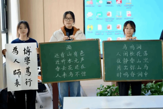 活动开始,翁一冉现场挥毫校训“博学笃行,为人师表”,王嘉哲、谢姝涵以粉笔书写《鸟鸣涧》、《画》经典小学语文诗篇。行云流水的展示,笔墨之间,见的是匠心,更是传承,一笔一划所展示的不仅是教师技能,更是师范精神内化于心,外化于行的体现。