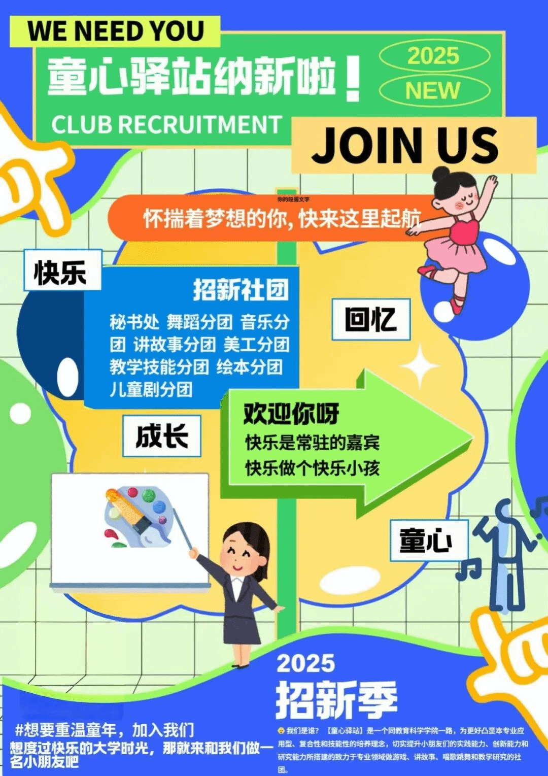 作为校园“十佳社团”,童心驿站始终聚焦儿童成长核心需求,以“陪伴传递知识,互动收获快乐”为宗旨,将绘本阅读、艺术互动、趣味教学等活动送到孩子身边,在温暖相处中定格与孩童相伴的纯粹感动。社团下设音乐、舞蹈、儿童剧、绘本、讲故事、美工、教学技能、秘书处八大特色分团,精准对接成员不同特长与热爱,让每一份关爱儿童的心意都能找到专属实践平台,成为连接校园爱心力量与儿童成长需求的优质桥梁。